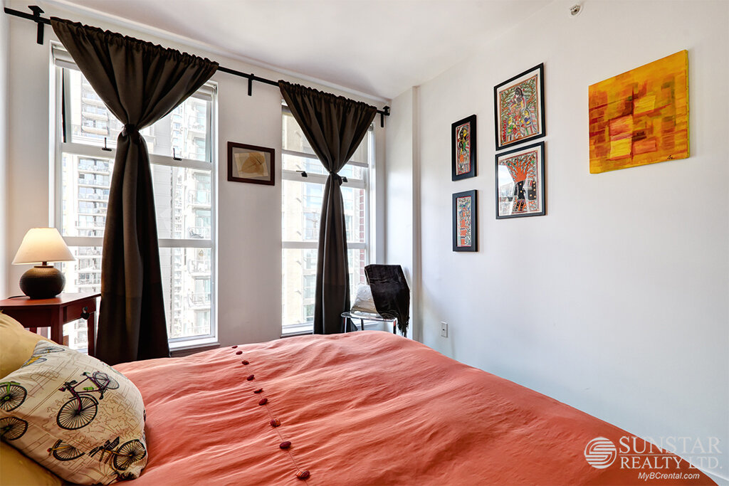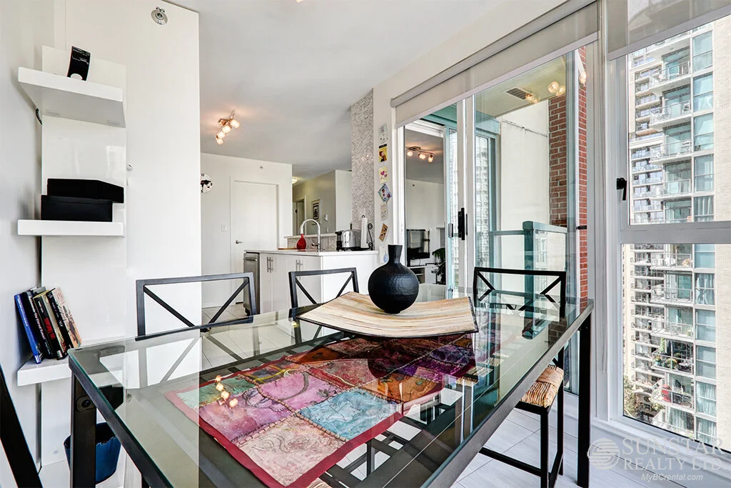 FEATURES: Lovely bright and stylish one bedroom + office in the popular Pinnacle building in the heart of Yaletown. This fully furnished 20th floor unit offers nice city and mountain views. Recently updated with nice touches, laminate hardwood floors throughout, Corian counters, french door fridge and pretty accent tile on walls and kitchen backsplash. Furnished in a contemporary bohemian style, it's stylish and comfortable. Cozy up to the gas fireplace on cold nights. Bedroom has a queen sized bed. Includes one under parking stall and insuite laundry.